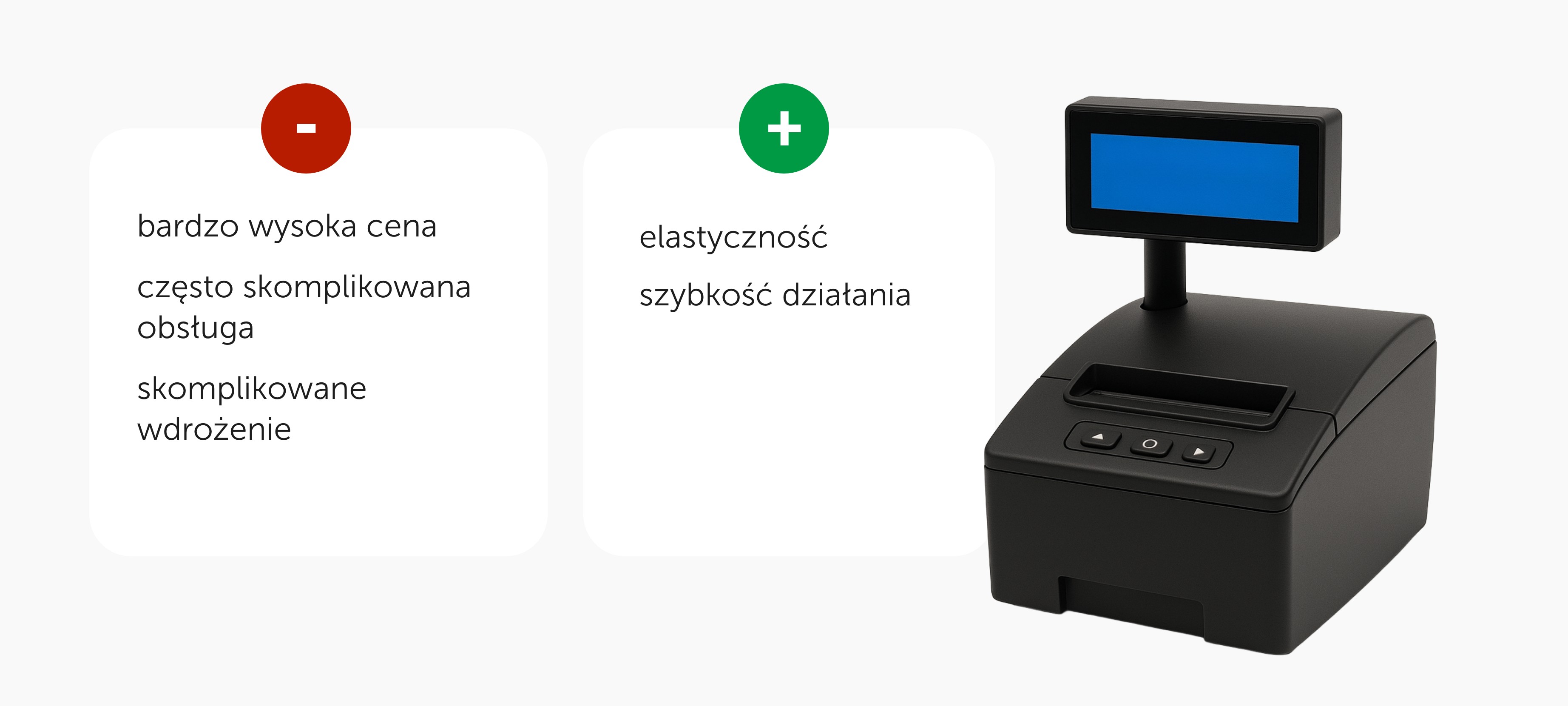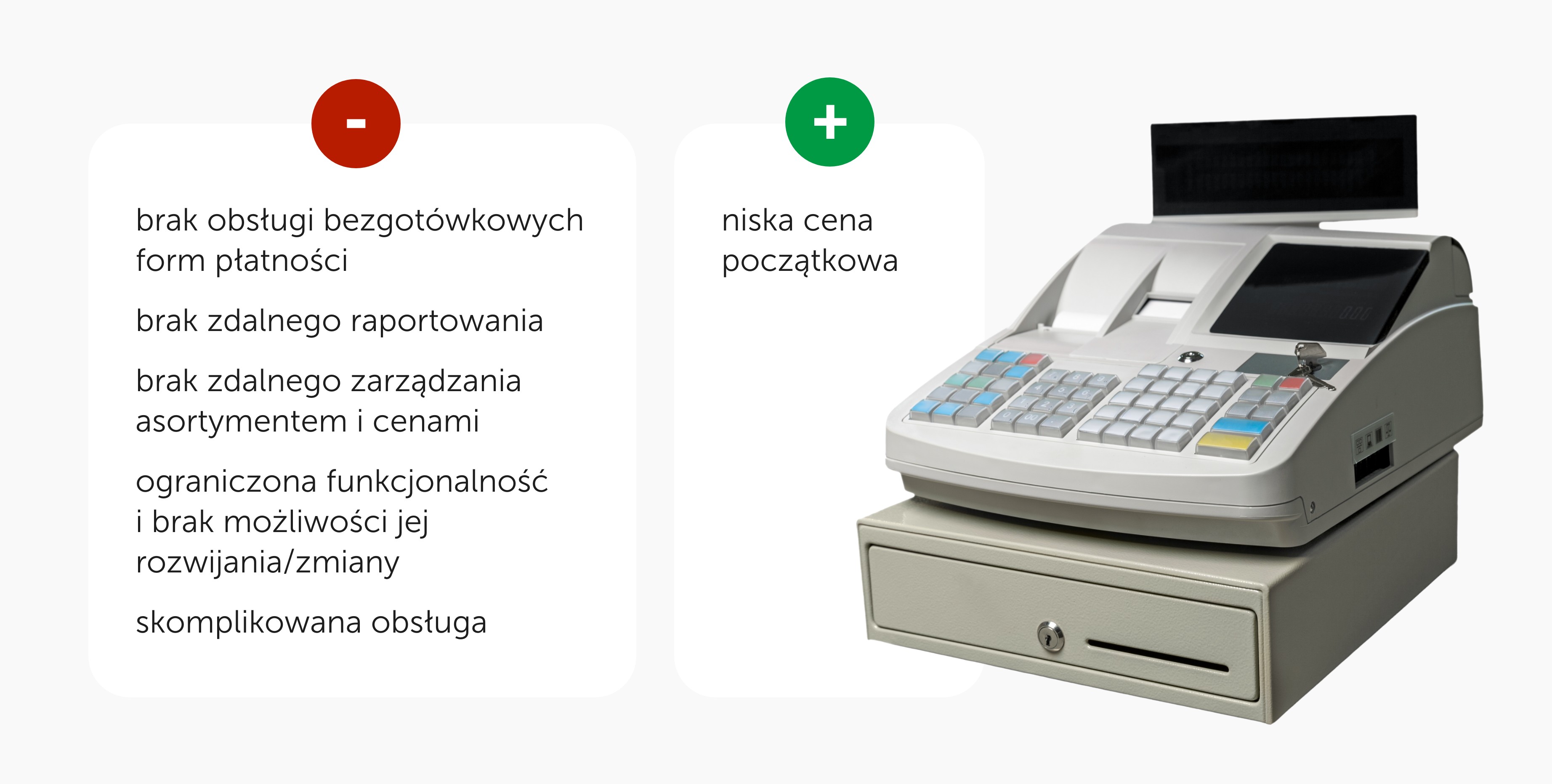 Aby obsłużyć płatności bezgotówkowe do kasy fiskalnej należy wydzierżawić osobne urządzenie jakim jest terminal płatniczy. Drugi dostawca idrugie urządzenie do obsługi z reguły oznaczają wyższe koszty, większą awaryjność i trudniejsze użytkowanie. Co więcej, zbiór wielu sprzętów wymaga rezerwacji sporego miejsca na blacie czy ladzie. Kolejną dużą wadą kas fiskalnych jest ich zamknięta na rozwój konstrukcja. Kasy fiskalne są certyfikowane w całości (urządzenie wraz z oprogramowaniem) co nie pozwala na zmiany w ich funkcjonalności w trakcie użytkowania.