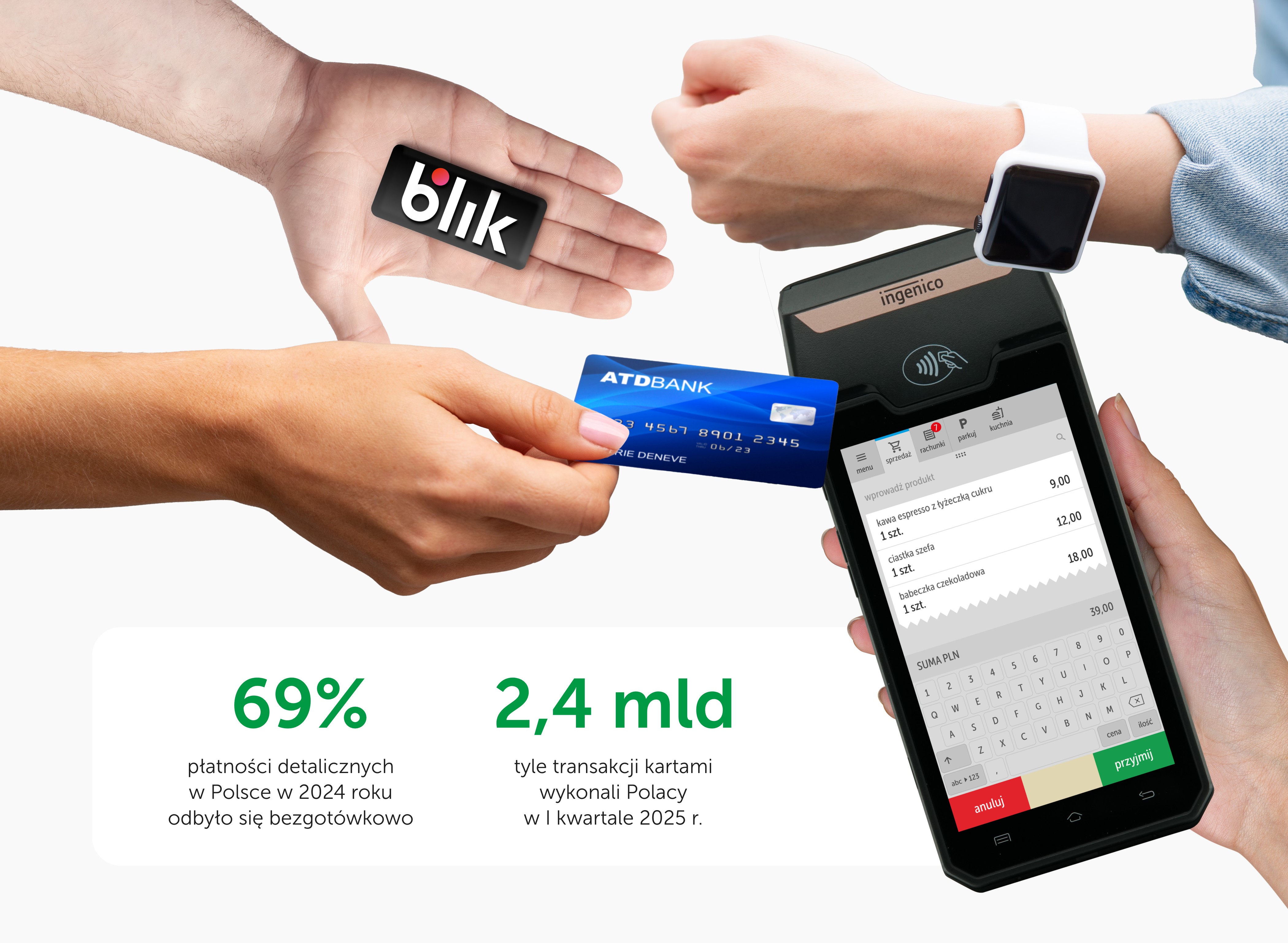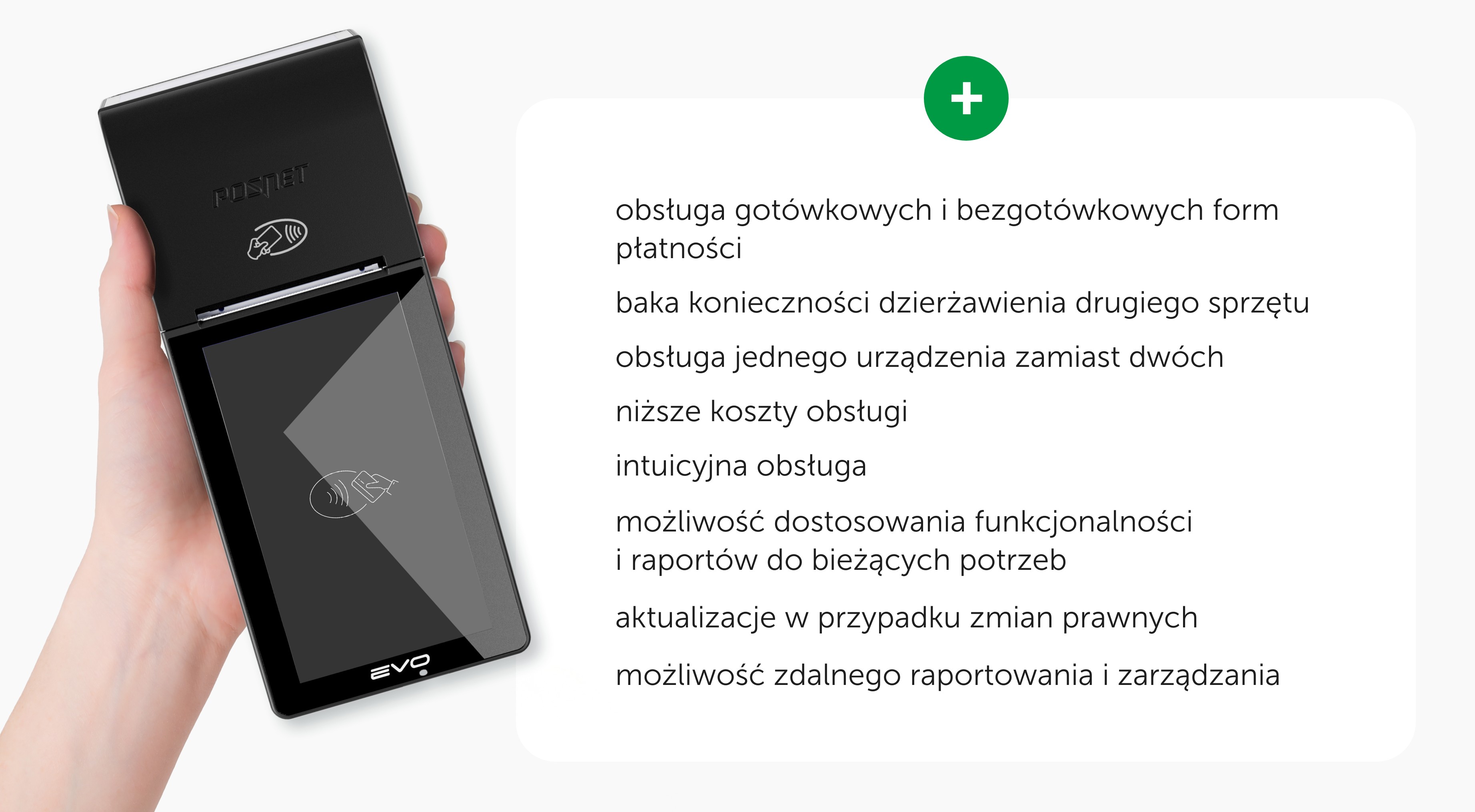 Standardowe kasy fiskalne obsługują wyłącznie płatność gotówką. Aby obsłużyć płatność bezgotówkową w kasie fiskalnej konieczna jest dzierżawa drugiego urządzenia jakim jest terminal płatniczy. Należy pamiętać, że obsługa płatności bezgotówkowych jest kluczowa dla rozwoju biznesu. Wg danych NBP ok 60% transakcji detalicznych, to transakcje obsługiwane bezgotówkowo. Jak zaznacza Michał Pawłowski, ekspert z firmy iPOS brak terminala płatniczego “To realne ograniczenie własnej sprzedaży. Klienci oczekują obsługi płatności kartą i rezygnują z zakupów kiedy nie jest ona dostępna. Klient woli zrezygnować z zakupu i udać się do innego sklepu niż udać się do bankomatu po gotówkę”.