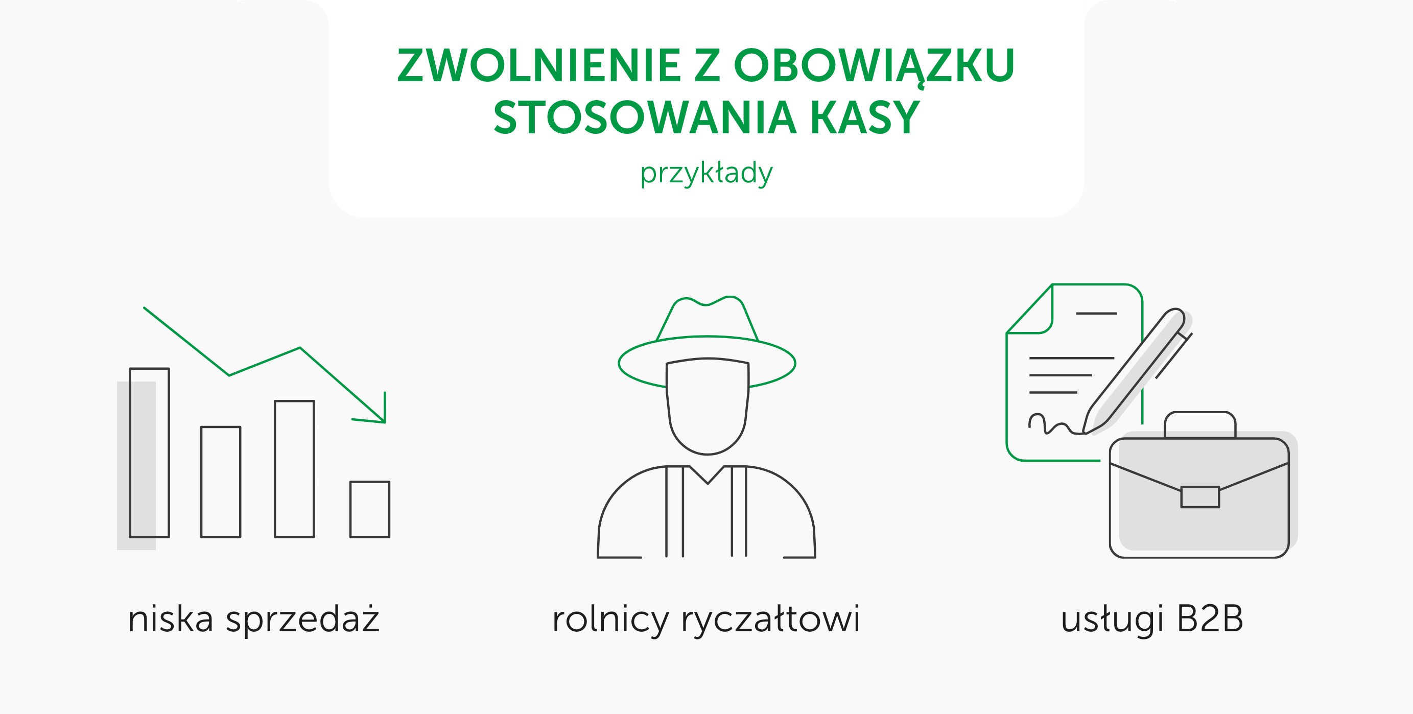 Zwolnienia dotyczą tylko wybranych branż i sytuacji. Aktualny wykaz znajduje się w rozporządzeniu Ministra Finansów. Zwolnienia obejmują m.in. niektóre usługi świadczone na rzecz firm (B2B), sprzedaż o niskiej wartości obrotu czy szczególne rodzaje działalności (np. rolnicy ryczałtowi). Pełna lista zwolnień z obowiązku stosowania kas fiskalnych znajduje się w “Rozporządzeniu Ministra Finansów w sprawie zwolnień z obowiązku prowadzenia ewidencji sprzedaży przy zastosowaniu kas rejestrujących”.