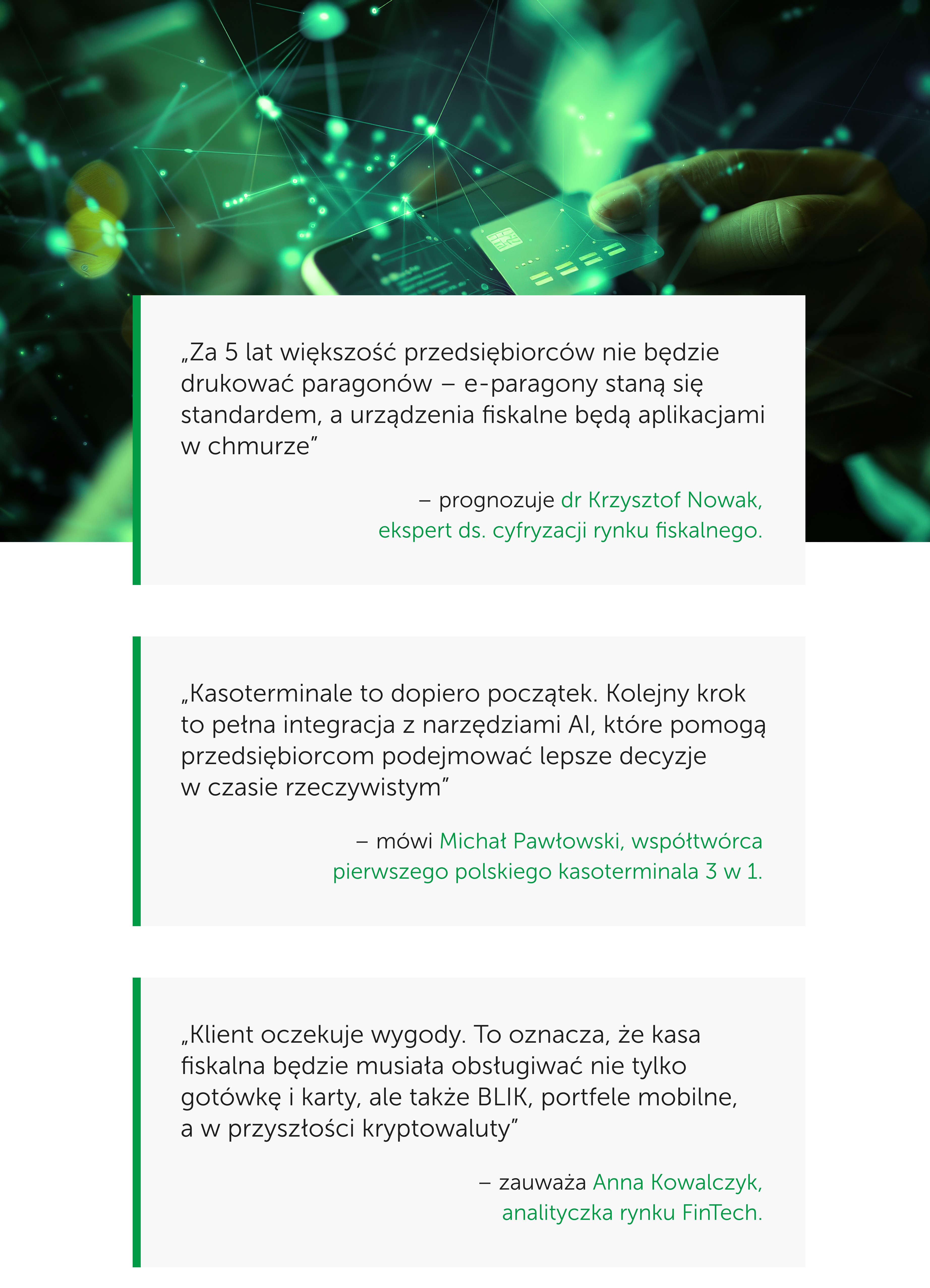 „Klient oczekuje wygody. To oznacza, że kasa fiskalna będzie musiała obsługiwać nie tylko gotówkę i karty, ale także BLIK, portfele mobilne, a w przyszłości kryptowaluty” – zauważa Anna Kowalczyk, analityczka rynku FinTech.