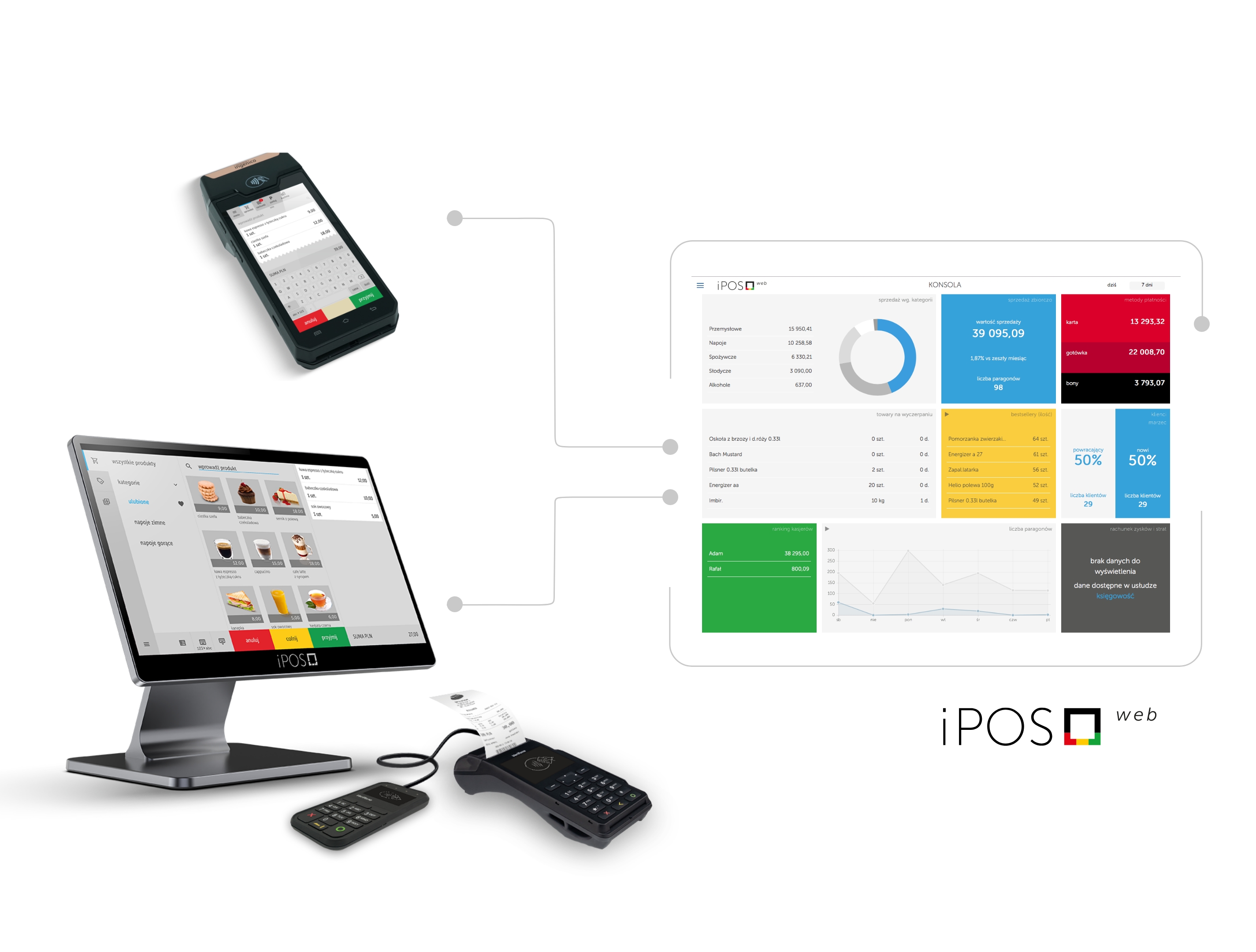 Kasoterminale 3 w 1 pozwalają na raportowanie i zarządzanie w całkowicie zdalny sposób. Kasoterminale są na stałe połączone z systemem do którego można się zalogować z dowolnego urządzenia z internetem.
